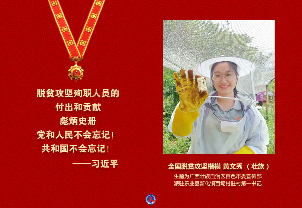 黃文秀同志把青春和熱血都獻給了脫貧攻堅事業,以實際行動詮釋了共產黨人的初心和使命,用短暫而精彩的人生譜寫了一曲新時代共產黨員的奉獻之歌。2019年6月17日犧牲在脫貧攻堅一線,年僅30歲。