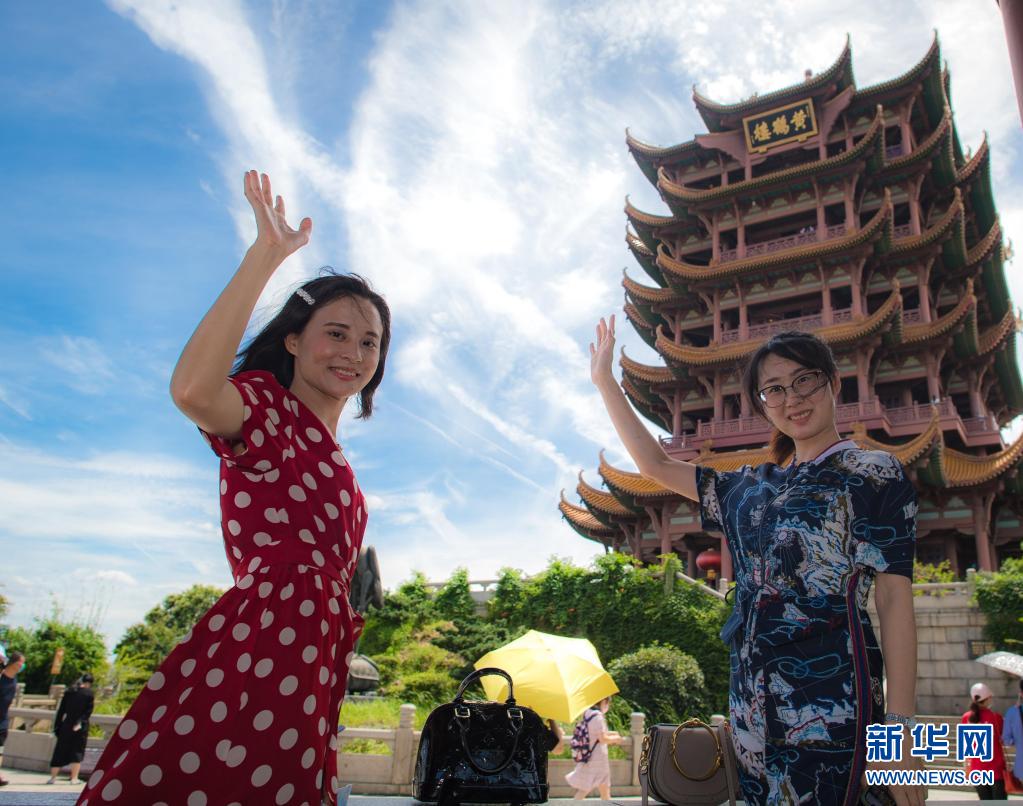 2020年8月7日,受邀來湖北旅游的海南援鄂醫(yī)療隊員陳小妹(左)與同事計超在黃鶴樓景區(qū)觀光。湖北省組織“與愛同行 惠游湖北”活動,陸續(xù)邀請援鄂醫(yī)護人員代表以及湖北醫(yī)護人員、社區(qū)工作者、志愿者等走進景區(qū),飽覽荊楚風貌。新華社記者 肖藝九 攝