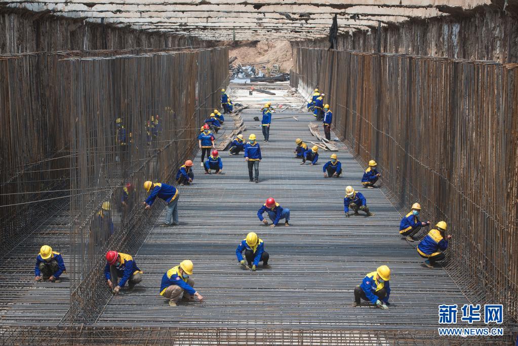 2020年4月30日,來自中鐵七局的建設者在武漢武九北綜合管廊工程施工現(xiàn)場作業(yè)。新華社記者 肖藝九 攝
