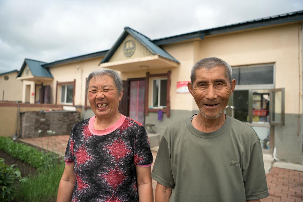 八岔村赫哲族脫貧戶劉永全(右)與老伴周洪香在赫哲新區(qū)的自家住房前合影(2020年7月21日攝)。新華社記者王建威攝
