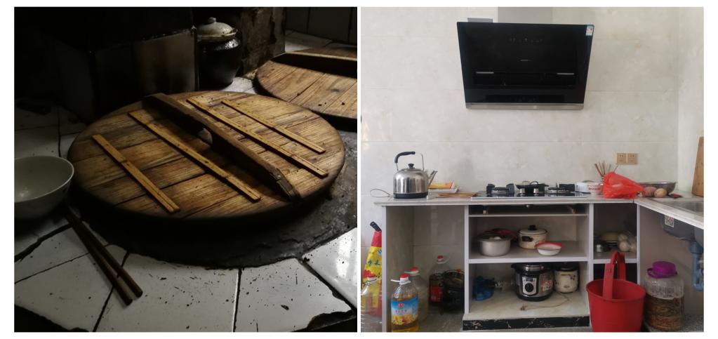 拼版照片:左圖為2017年8月29日,記者在一戶農家中拍攝的土灶臺。