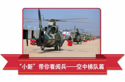 方隊由26架直升機和7架教練機組成。國旗和軍旗分別由1架直升機在正下方懸掛、由2架直升機護衛(wèi),組成兩組三機梯隊,呈品字形依次通過。緊隨其后的是由20架直升機組成“70”字樣,寓意中華民族以抗戰(zhàn)勝利為起點走向偉大復興的征程。這是我國在閱兵中首次采用紀念數(shù)字的編隊飛行。