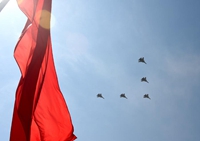 - 空中護旗方隊率先飛過天安門上空