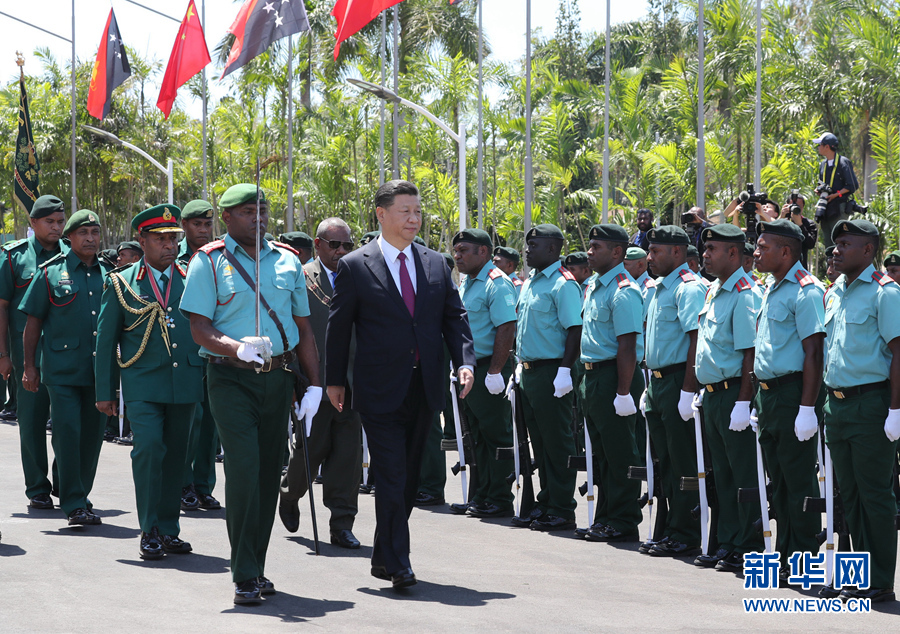 11月16日,國家主席習近平在莫爾茲比港會見巴布亞新幾內亞總督達達埃。會見開始前,達達埃在議會大廈前廣場為習近平舉行隆重歡迎儀式。新華社記者 費茂華 攝