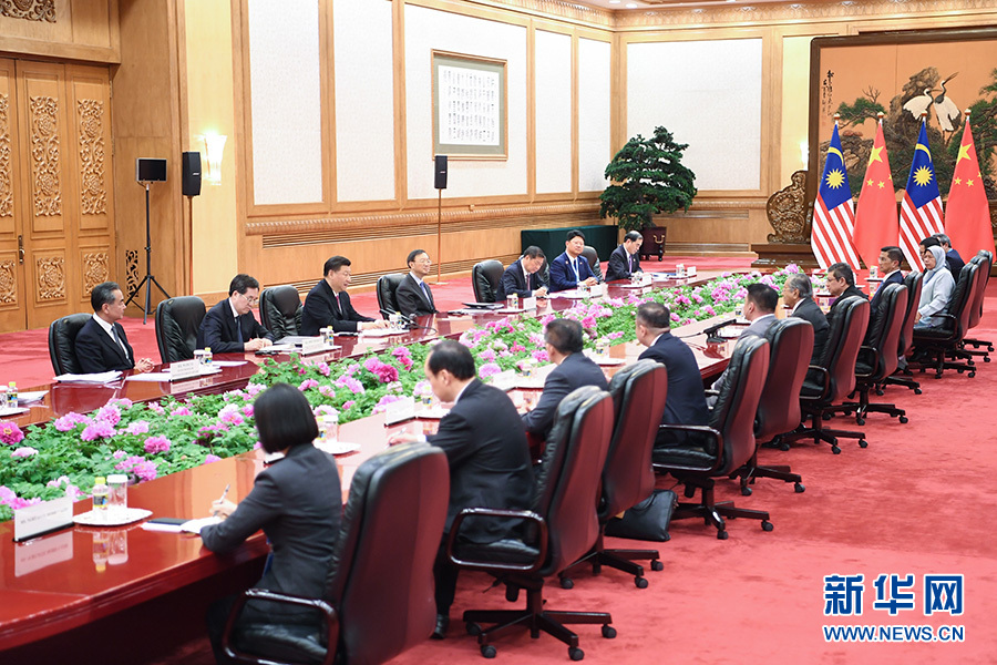 習近平指出,中國和馬來西亞建交45年,一半時間在馬哈蒂爾先生總理任內,你對中馬關系發展作出了重要貢獻。當前,兩國關系站在了新的歷史起點上。我們要以共建“一帶一路”為機遇,為中馬關系開創美好未來。雙方要堅持中馬友好,相互尊重和信任;照顧彼此重大關切,相互理解和支持。共建“一帶一路”可以推動中國全方位開放,這為世界各國、特別是周邊國家帶來更大機遇。中馬共建“一帶一路”基礎扎實,前景可期,雙方要加強規劃,做大合作平臺,推進高質量合作,要把“兩國雙園”做大做強,使其成為“陸海新通道”重要節點,促進兩國和地區聯通和發展??偫硐壬缟小皝喼迌r值觀”,倡導發展中國家團結合作,在當前形勢下有重要現實意義。雙方要加強多邊協作,推動中國-東盟合作提質升級。中方支持馬方明年當好亞太經合組織會議東道主,推動區域經濟一體化和經濟全球化,推動構建開放型世界經濟。