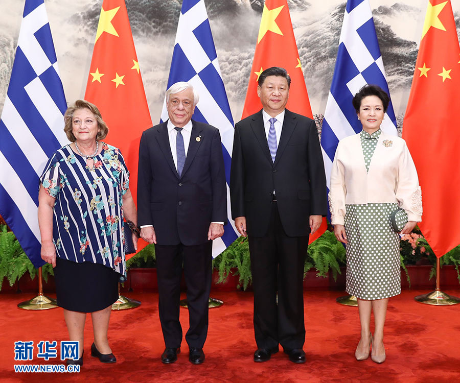 5月14日,國家主席習近平在北京人民大會堂同希臘總統帕夫洛普洛斯舉行會談。這是習近平和夫人彭麗媛同帕夫洛普洛斯夫婦合影。 新華社記者 鞠鵬 攝