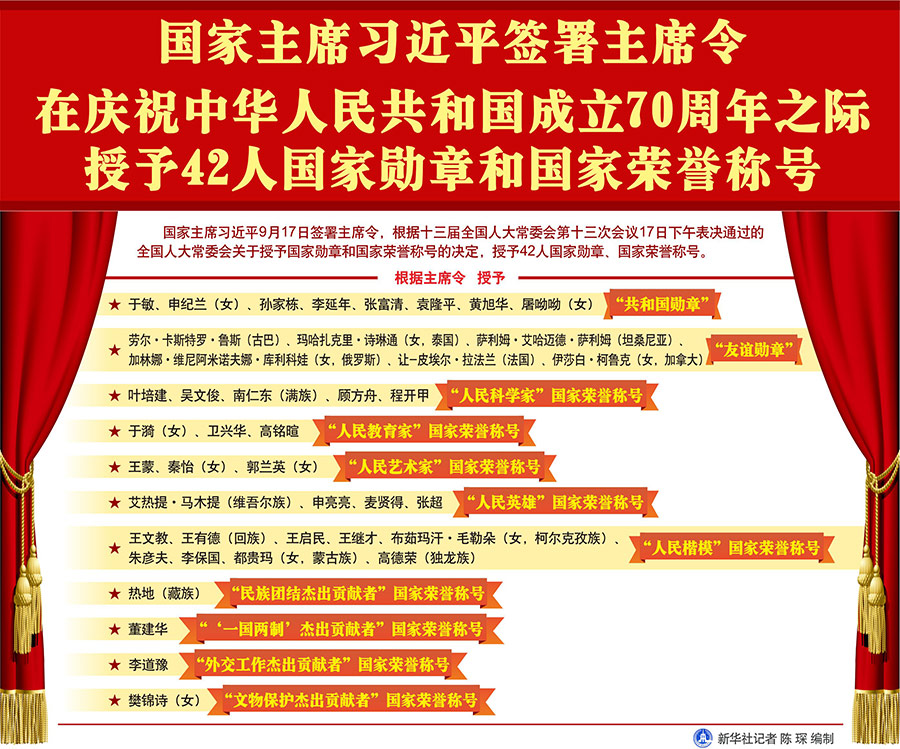 新華社北京9月17日電? 國家主席習(xí)近平17日簽署主席令,根據(jù)十三屆全國人大常委會第十三次會議17日下午表決通過的全國人大常委會關(guān)于授予國家勛章和國家榮譽稱號的決定,授予42人國家勛章、國家榮譽稱號。