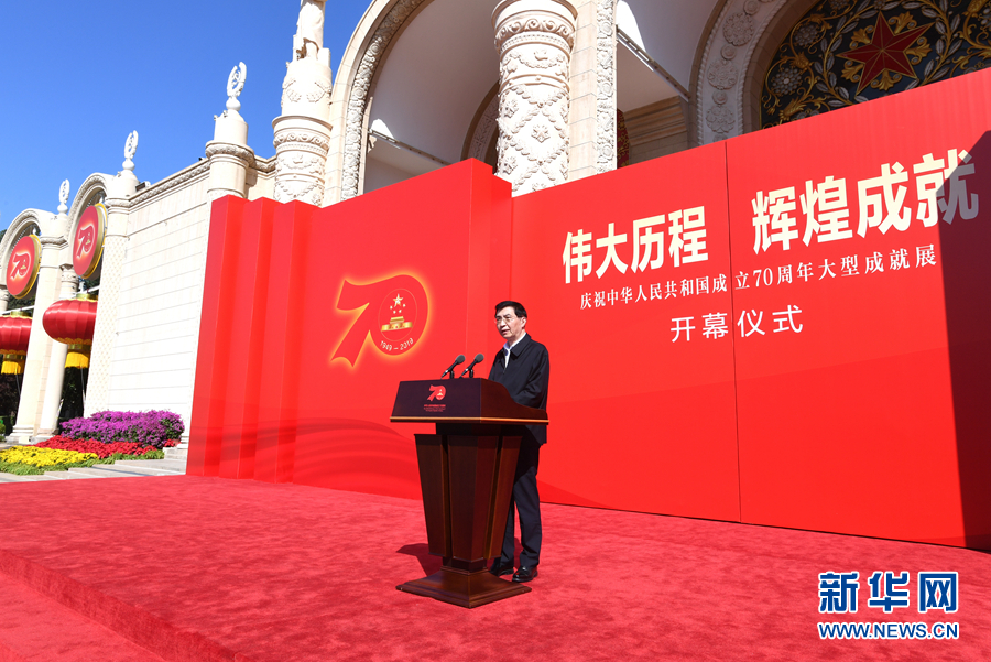 9月23日,“偉大歷程 輝煌成就——慶祝中華人民共和國成立70周年大型成就展”開幕式在北京展覽館舉行。中共中央政治局常委、中央書記處書記王滬寧主持開幕式并宣布成就展開幕。 新華社記者 饒愛民 攝