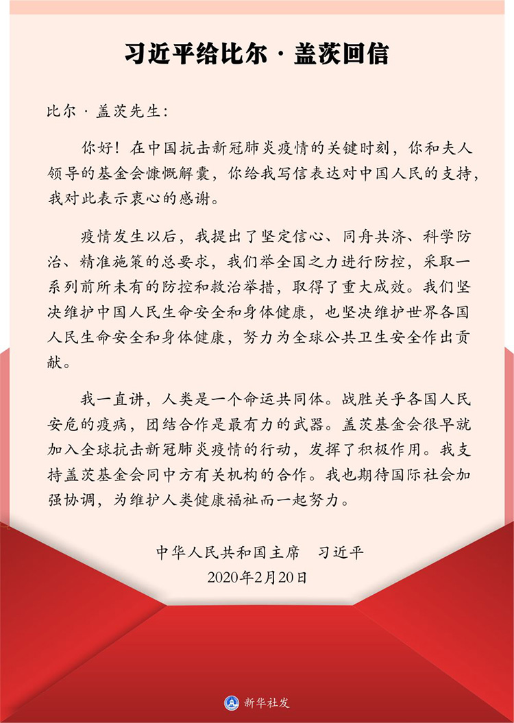 2月20日,在給美國蓋茨基金會聯席主席比爾·蓋茨的回信中,習近平主席這樣寫道。