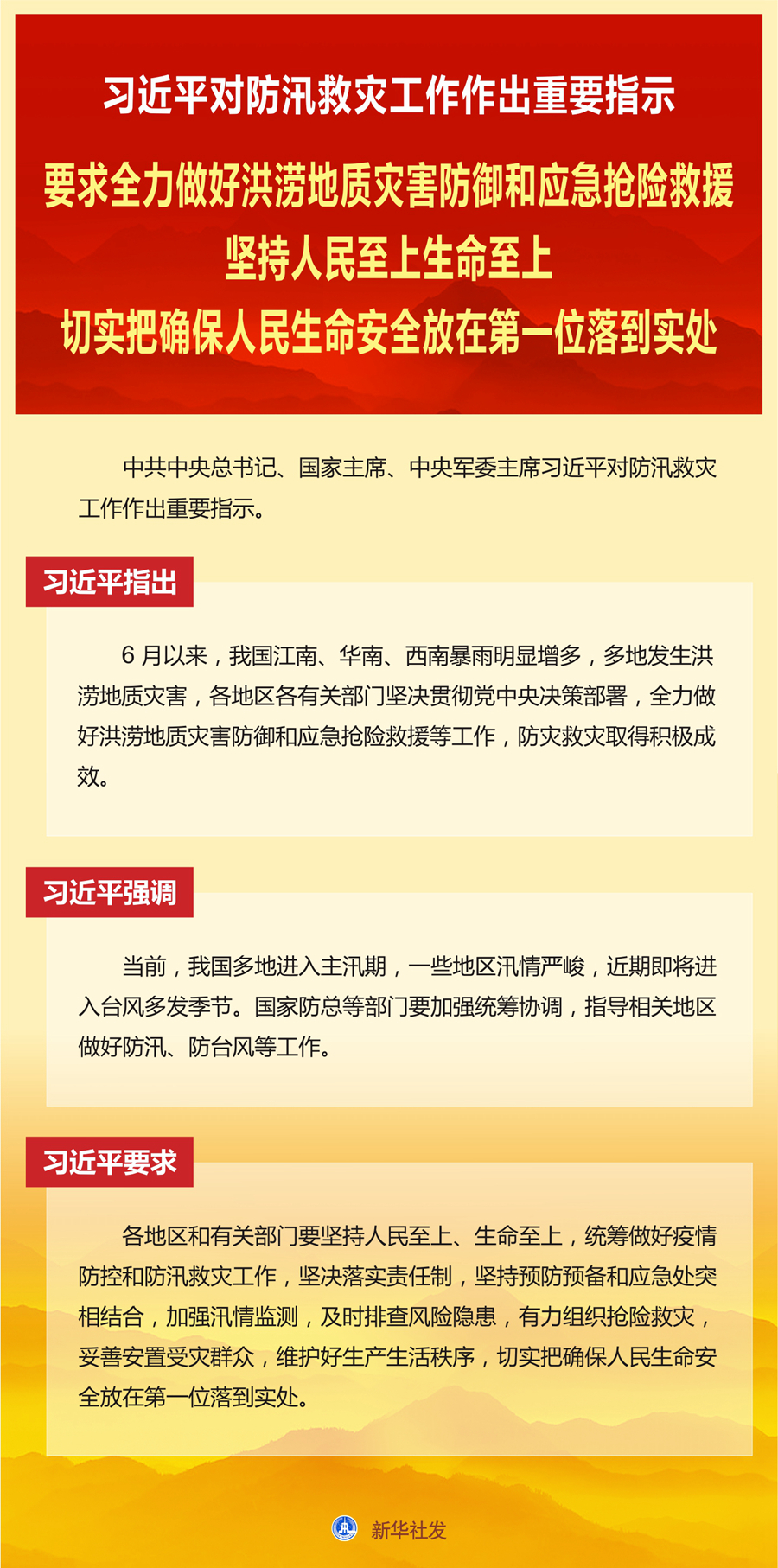 習近平要求,各地區和有關部門要堅持人民至上、生命至上,統籌做好疫情防控和防汛救災工作,堅決落實責任制,堅持預防預備和應急處突相結合,加強汛情監測,及時排查風險隱患,有力組織搶險救災,妥善安置受災群眾,維護好生產生活秩序,切實把確保人民生命安全放在第一位落到實處。