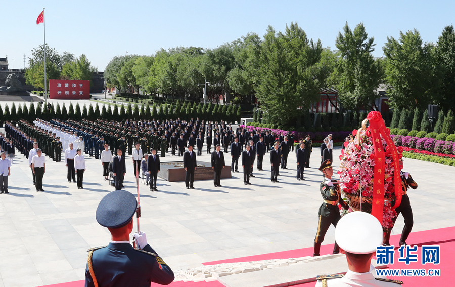 新華社北京9月3日電(記者張曉松、朱基釵)銘記歷史緬懷先烈,珍愛和平開創未來。9月3日上午,紀念中國人民抗日戰爭暨世界反法西斯戰爭勝利75周年向抗戰烈士敬獻花籃儀式在中國人民抗日戰爭紀念館舉行。黨和國家領導人習近平、李克強、栗戰書、汪洋、王滬寧、趙樂際、韓正、王岐山,同各界代表一起出席儀式。