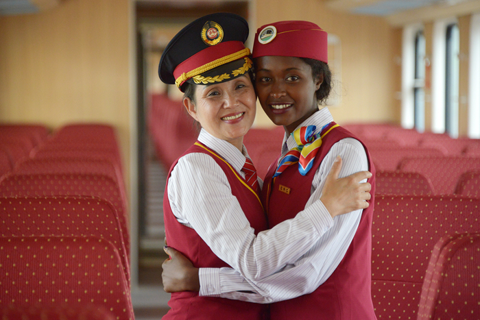 2016年10月1日,在埃塞俄比亞首都亞的斯亞貝巴拉布車站,中方列車長丁繼華(左)和埃塞俄比亞乘務員沃克內什·貝特魯擁抱。新華社記者孫瑞博攝