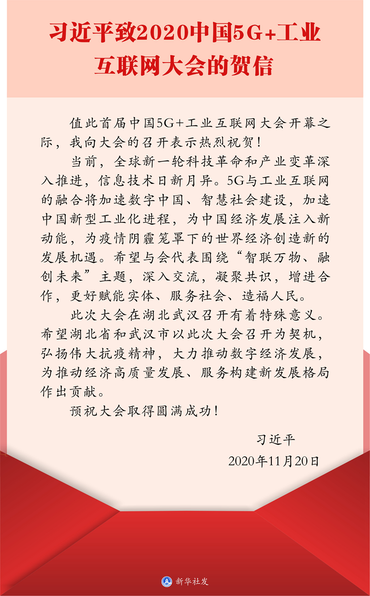 新華社武漢11月20日電 2020中國5G+工業(yè)互聯(lián)網(wǎng)大會20日在湖北省武漢市開幕。中共中央總書記、國家主席、中央軍委主席習近平發(fā)來賀信,向大會的召開表示熱烈祝賀。