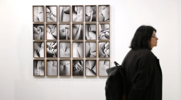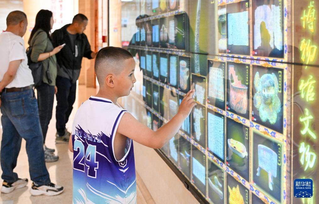 5月14日,游客在吐鲁番博物馆文物数字展示区参与互动。