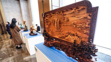 虞金顺在艺术馆介绍自己创作的乐清黄杨木雕作品《中国梦》(11月25日摄)。