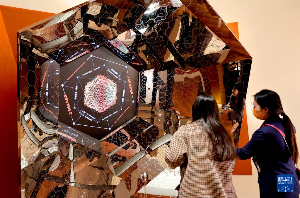 1月9日,参观者在展览上体验名为《情绪几何5.0》的互动装置艺术品。