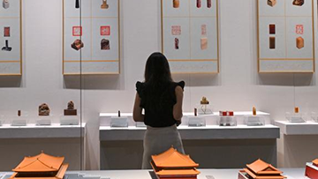 8月16日,观众在鄂尔多斯市博物院观赏建造于北齐的彩绘石雕菩萨像。