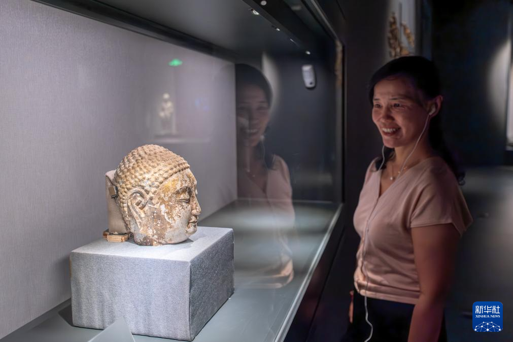 8月16日,观众在鄂尔多斯市博物院欣赏佛教造像。