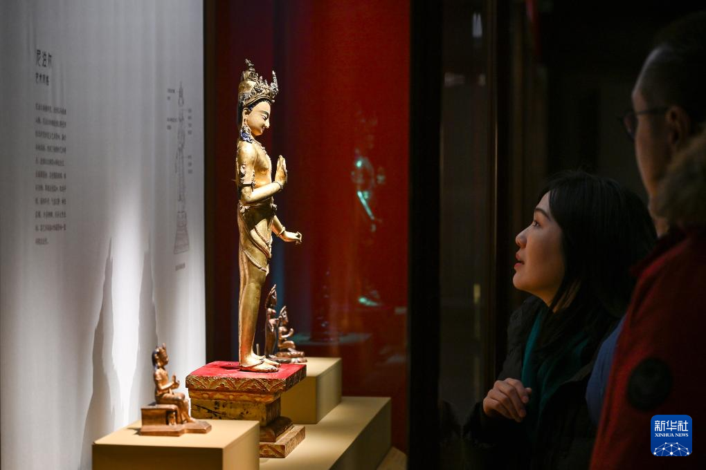 2月9日,参观者在展览上观看尼泊尔菩萨造像。