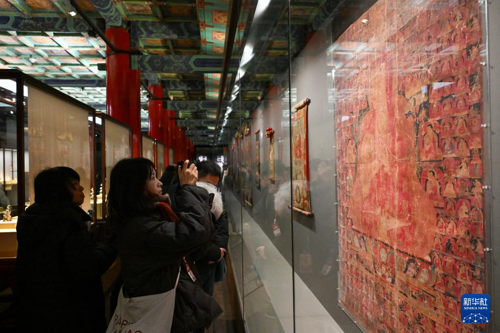 2月9日,参观者在展览上拍摄描绘萨迦班智达的唐卡。