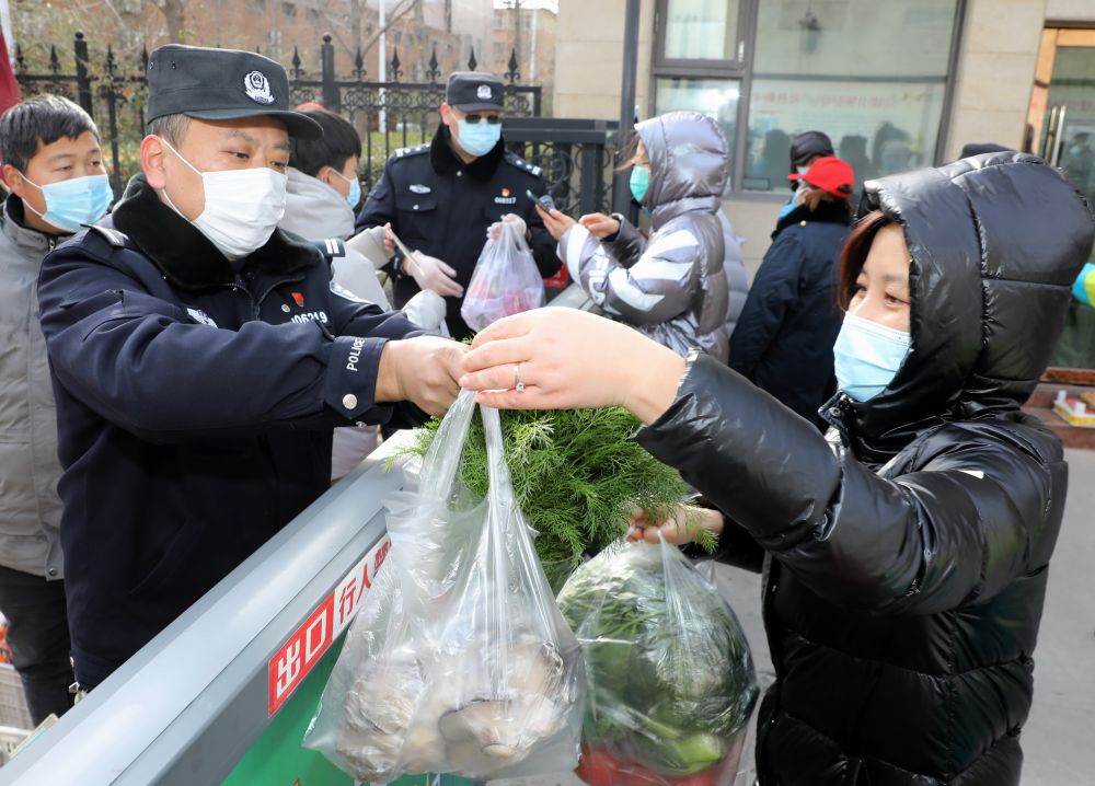 ↑ 1月10日,在石家莊市橋西區東風北路社區,民警在協助蔬菜配送員為居民配送蔬菜。