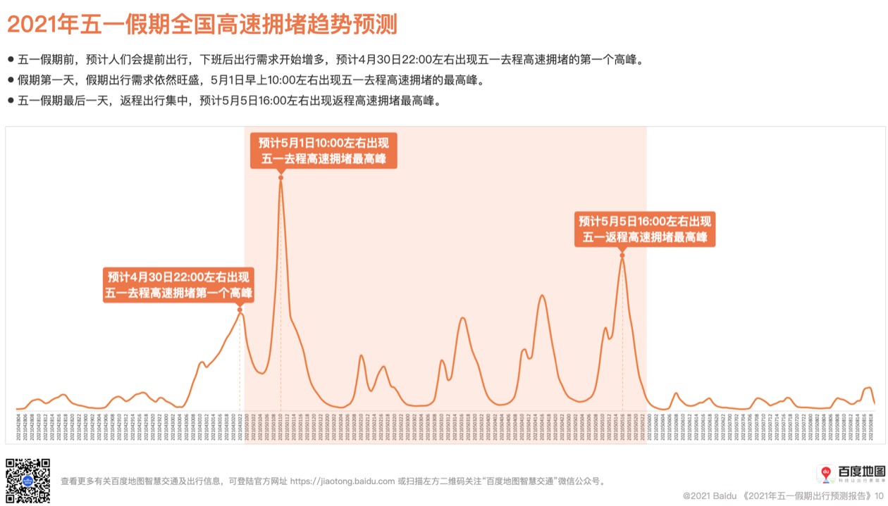 ????? 假期前,預計人們會提前出行,下班后出行需求開始增多,預計4月30日22:00左右出現(xiàn)五一去程高速擁堵的第一個高峰。