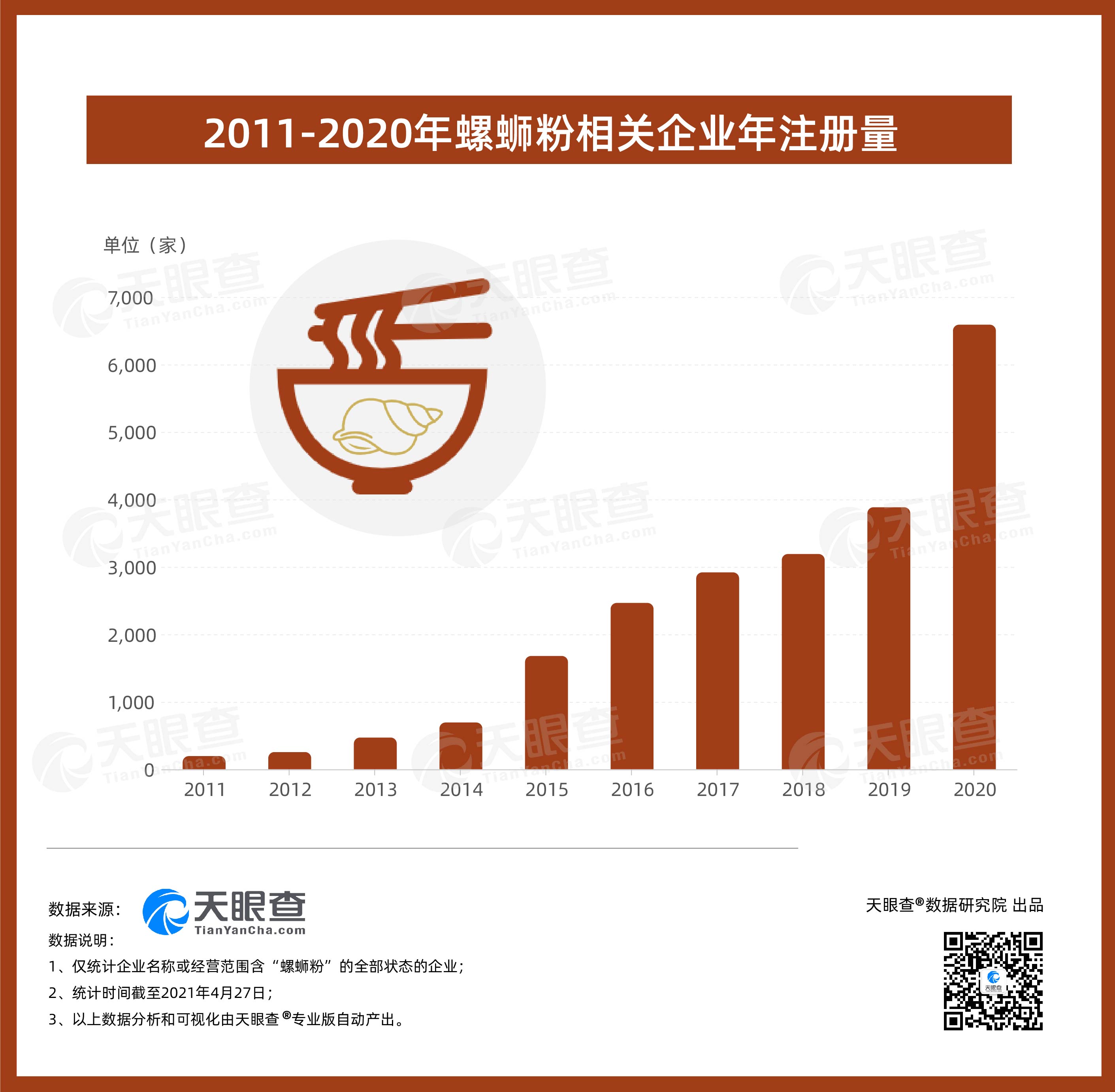 ????? 這碗起源于20世紀七八十年代夜市的地方小吃,如今是柳州最亮眼的新名片之一。從2014年底第一家袋裝螺螄粉企業誕生,到2020年產值超百億元,僅僅用了6年時間。袋裝螺螄粉如今遠銷海外20多個國家和地區,約25萬個就業崗位遍布在全產業鏈各個環節。天眼查數據顯示,我國目前有超1.8萬家企業名稱或經營范圍含“螺螄粉”,且狀態為在業、存續、遷入、遷出的螺螄粉相關企業。其中,近9成的相關企業注冊時間在5年之內。