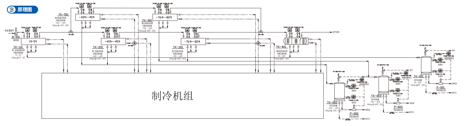 同時(shí),部分?藝要求連續(xù)?時(shí)間?產(chǎn)?作,為確保此過(guò)程中VOCs?體回收的連續(xù)性,我公司可選擇提供的VOCs?體回收設(shè)備的冷凝單元(-40℃和-75℃冷場(chǎng))為雙?路通道,當(dāng)?邊?路壓降達(dá)到設(shè)定值時(shí),系統(tǒng)?動(dòng)切換到另?待機(jī)系統(tǒng)?作,同時(shí)冰堵通道進(jìn)?融霜過(guò)程,融冰結(jié)束后可根據(jù)指令?動(dòng)快速地恢復(fù)冷場(chǎng),處于恒溫狀態(tài),確保溢出?體的持續(xù)穩(wěn)定回收。