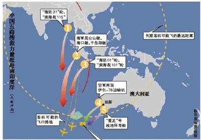 中國外交部發言人洪磊21日在介紹馬航失聯客機搜尋情況時表示,中澳保持密切溝通和協調,中方派遣有關的軍機和船艦前往相關海域得到了澳方的支持和配合。他說,交通運輸部進一步優化后續搜救方案。中國海上搜救中心指示南下編隊“海巡01”輪、“南海救101”輪繼續按原定搜尋方案向圣誕島以南部分的我方南部搜尋區域搜索前進,并逐漸向發現疑似失聯客機殘骸海域靠近;北上編隊“海巡31”輪、“南海救115”輪逐漸向我方南部搜尋區前進,從北向南開展搜尋工作。目前,海軍昆侖山艦、海口艦、千島湖艦等已趕赴南印度洋疑似發現失聯客機殘骸的海域。