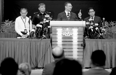 昨天,馬方發布會在吉隆坡舉行,代理交通部長希沙姆丁(左三)在發布會上答記者問。中新社發