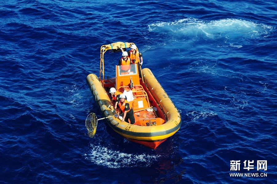????3月29日上午,在南印度洋,工作人員乘“海巡01”輪的船載小艇在疑似水域進(jìn)行搜尋。