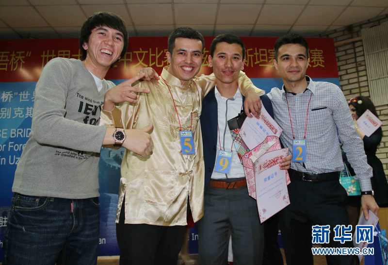 4月25日,烏茲別克斯坦塔什干國立東方學院大禮堂比賽現場,獲獎選手在合影留念。