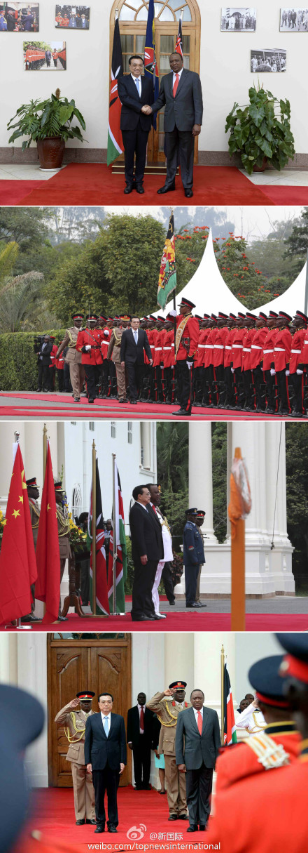 ????新華網(wǎng)北京5月10日電? 據(jù)新華社“新國際”微博報(bào)道,肯尼亞總統(tǒng)肯雅塔10日上午在國家宮為中國總理李克強(qiáng)舉行隆重歡迎儀式?,F(xiàn)場(chǎng)鳴放禮炮,軍樂隊(duì)奏兩國國歌。李克強(qiáng)檢閱了儀仗隊(duì)。