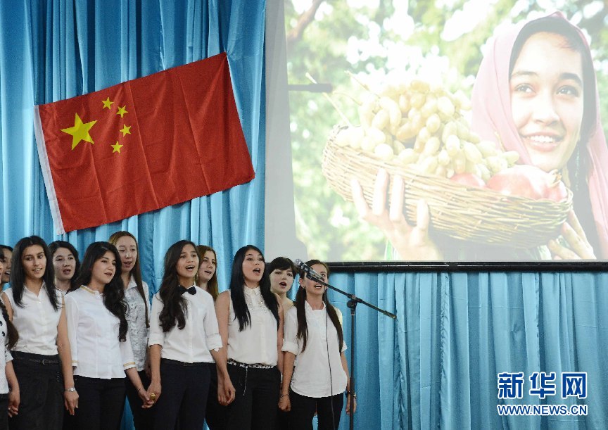 6月9日,學生代表在烏茲別克斯坦首都塔什干的烏世界語言大學禮堂表演節目。