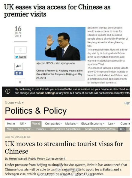 ????新華網北京6月17日電 據新華社“新國際”微博報道,李克強總理16日開始英國之行,英方當日宣布將放寬對中國游客和商務人士的簽證限制,簡化中國個人旅行者網簽申請程序,而且英國正與其他歐洲國家談判,希望允許中國旅行者通過單一程序申請英國和申根國家簽證。此前,簽證難辦一直困擾赴英中國民眾。
