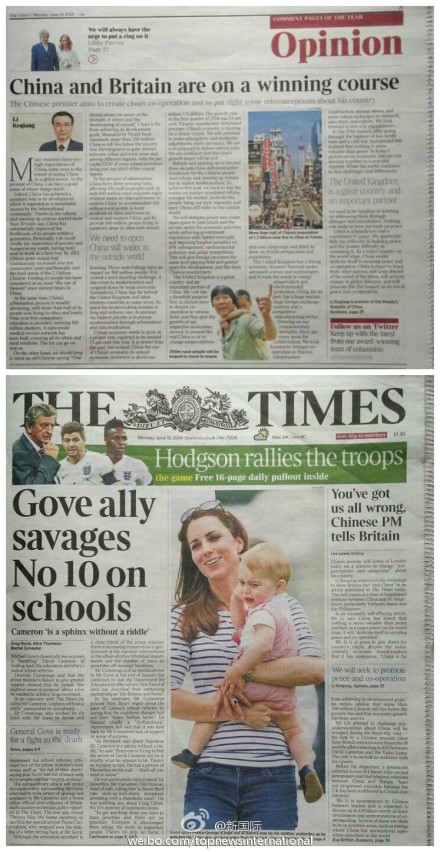 ????新華網北京6月17日電 據新華社“新國際”微博報道,訪英前夕,李克強總理16日在英國主流媒體《泰晤士報》發表題為“中英正走在共贏的道路上”的署名文章。對此,該報同日在頭版配發文章稱,李克強的文章標志著一場“展示真正中國的運動”已開始,中國作為世界重要國家,將為維護和平與合作作出積極貢獻。?
