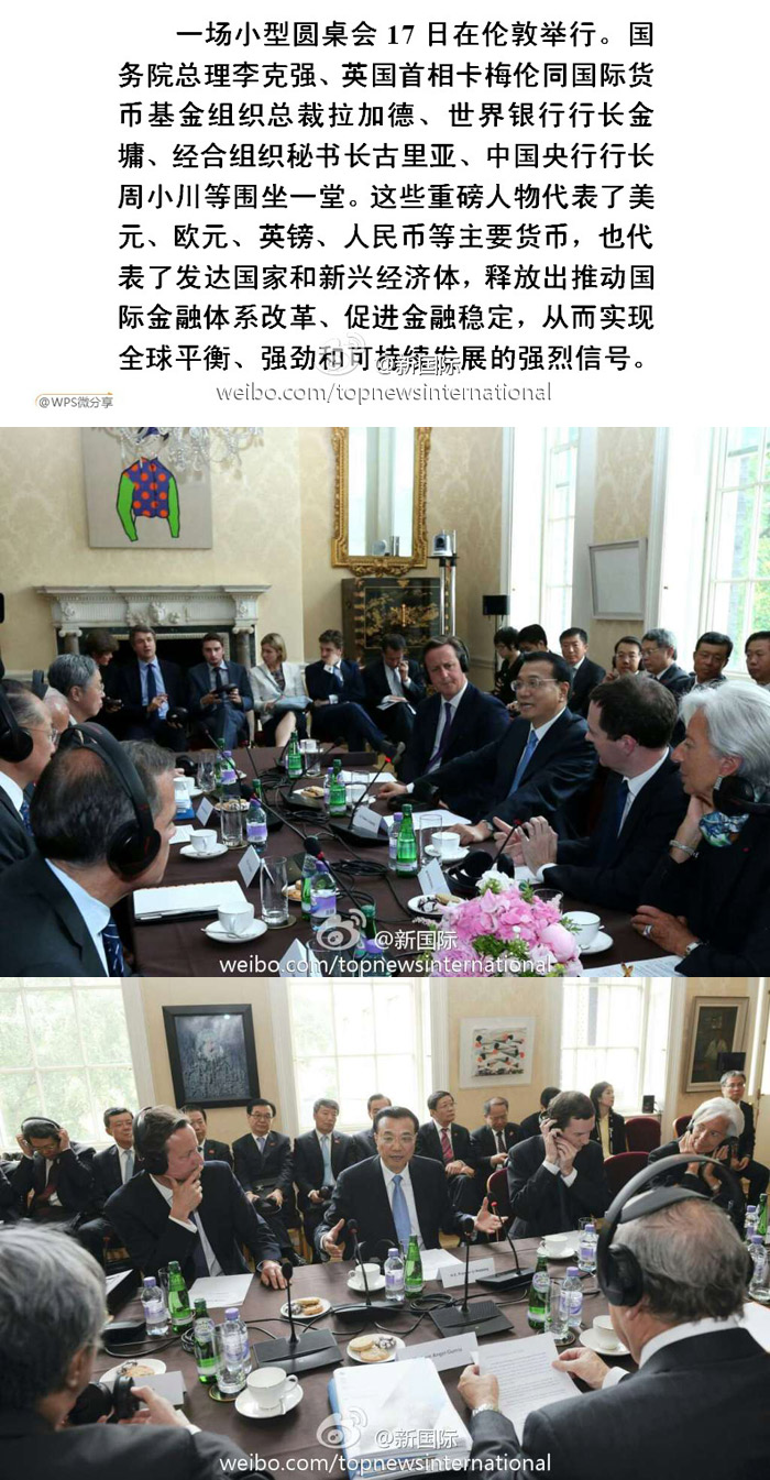 ??? 新華網北京6月18日電 據新華社“新國際”微博報道。一場小型圓桌會17日在倫敦舉行。國務院總理李克強、英國首相卡梅倫同國際貨幣基金組織總裁拉加德、世界銀行行長金墉、經合組織秘書長古里亞、中國央行行長周小川等圍坐一堂。