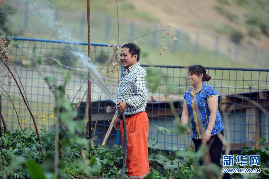 ????7月5日,烏茲別克斯坦安革連至琶布鐵路隧道項目安革連隧道進口西口分部生活區,楊清海在澆水。(沙達提 攝)