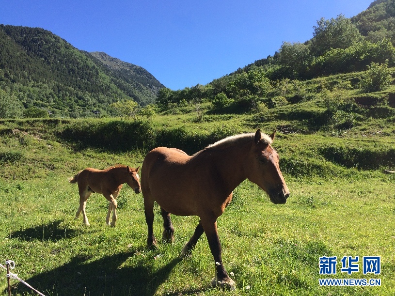 ????安道爾境內山路邊一塊平坦的草地上,兩匹馬在悠閑地散步。(周喆 攝)