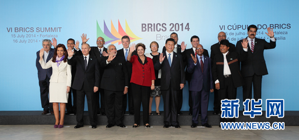 ????新華網巴西利亞7月16日電(記者陳威華、錢彤)7月16日,金磚國家同南美國家領導人對話會在巴西利亞舉行。中國國家主席習近平、巴西總統羅塞夫、俄羅斯總統普京、印度總理莫迪、南非總統祖馬以及蘇里南總統鮑特塞、阿根廷總統克里斯蒂娜、玻利維亞總統莫拉萊斯、哥倫比亞總統桑托斯、智利總統巴切萊特、厄瓜多爾總統科雷亞、圭亞那總統拉莫塔爾、巴拉圭總統卡特斯、秘魯總統烏馬拉、烏拉圭總統穆希卡、委內瑞拉總統馬杜羅等南美國家領導人共同出席。