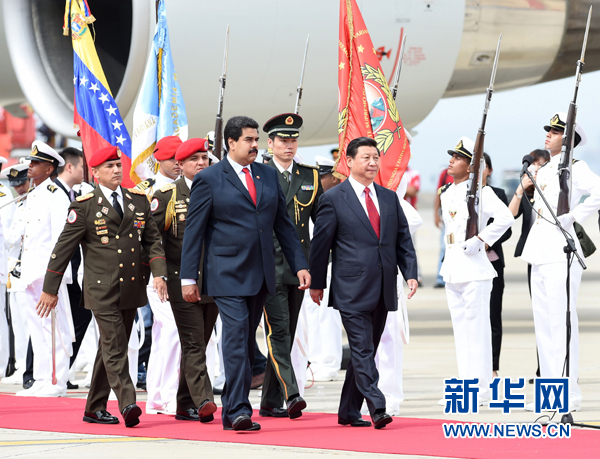 ??? 當(dāng)?shù)貢r(shí)間7月20日,國(guó)家主席習(xí)近平抵達(dá)加拉加斯,開始對(duì)委內(nèi)瑞拉進(jìn)行國(guó)事訪問(wèn)。委內(nèi)瑞拉總統(tǒng)馬杜羅在機(jī)場(chǎng)為習(xí)近平舉行隆重歡迎儀式。新華社記者劉建生攝
