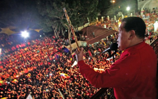????2012年10月7日,在得知自己成功當選總統后,查韋斯面對支持者們舉起了玻利瓦爾之劍