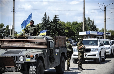 7月31日,烏克蘭政府軍車護送專家組車隊進入墜機現場。