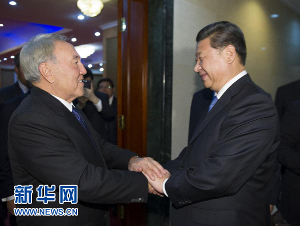 習近平指出,這是我們今年第四次見面。中哈保持密切高層交往,充分體現了中哈全面戰略伙伴關系的高水平和特殊性,對指導兩國關系發展非常重要。今年5月你對中國進行國事訪問并出席亞洲相互協作與信任措施會議第四次峰會,我們當時達成的各項共識正得到有效落實。你關心的擴大哈方農產品和礦產資源對華出口問題,我已責成中方有關部門研究并正在積極解決。