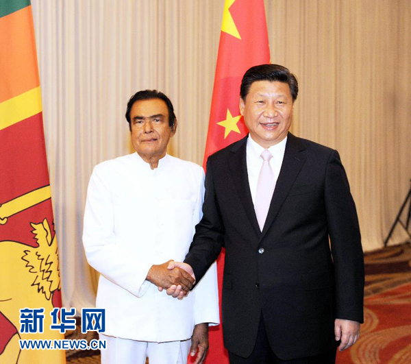 ????習(xí)近平贊賞賈亞拉特納長期致力于推動中斯關(guān)系發(fā)展,是中斯友誼的見證者和推動者。習(xí)近平指出,昨天我同拉賈帕克薩總統(tǒng)進行了富有成果的會談,就深化雙邊關(guān)系達成廣泛共識,對中斯關(guān)系未來發(fā)展作出規(guī)劃,雙方要扎扎實實推進,一件一件落實。雙方要加快推進中斯自由貿(mào)易談判,穩(wěn)步推進漢班托塔港等大項目合作,拓展旅游、海洋科研、海洋經(jīng)濟、港口建設(shè)、海上安全等領(lǐng)域合作,共同推進21世紀(jì)海上絲綢之路建設(shè),加強旅游合作,促進兩國人員交往。雙方要加強多邊領(lǐng)域合作,中方歡迎斯方作為創(chuàng)始成員國參與籌建亞洲基礎(chǔ)設(shè)施投資銀行。