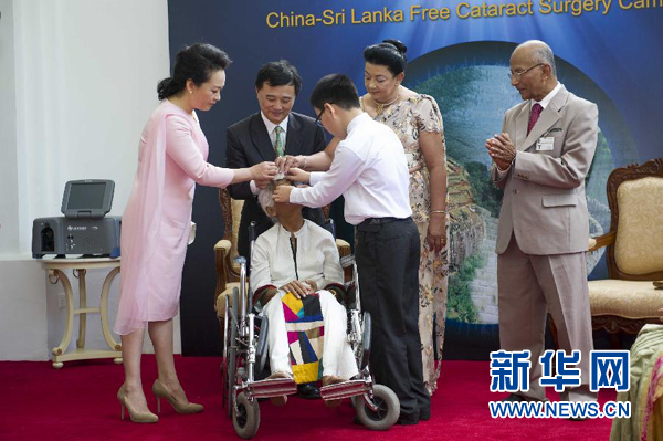 ????在兩國元首夫人共同見證下,許鵬飛為一位接受復(fù)明手術(shù)的斯里蘭卡白內(nèi)障患者揭開紗布。彭麗媛和施蘭蒂向在場的斯里蘭卡復(fù)明患者致以問候和祝福。彭麗媛向斯方贈送白內(nèi)障手術(shù)儀器,鼓勵“中斯友好光明行”活動繼續(xù)譜寫中斯友好交往的佳話。