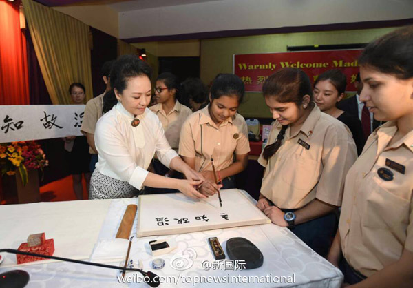 ????新華網(wǎng)北京9月18日電 據(jù)新華社“新國(guó)際”微博報(bào)道,習(xí)近平主席夫人彭麗媛18日上午在新德里參觀泰戈?duì)枃?guó)際學(xué)校時(shí),用毛筆書(shū)寫(xiě)成語(yǔ)“溫故知新”,并簽名蓋上印章。她對(duì)師生們逐字講解后說(shuō),我們要經(jīng)常溫習(xí)學(xué)過(guò)的知識(shí),不斷學(xué)習(xí)掌握新知識(shí),開(kāi)拓創(chuàng)新,與時(shí)俱進(jìn)。希望同學(xué)們認(rèn)真學(xué)習(xí),更好報(bào)效祖國(guó),祝你們成功。