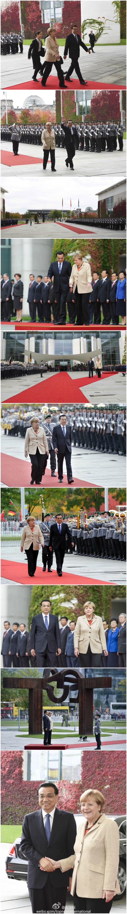 ????新華網北京10月10日電 據新華社“新國際”微博報道,當地時間10月10日,德國總理默克爾在總理府舉行隆重歡迎儀式,歡迎李克強總理的來訪。儀式上奏起兩國國歌,李克強在默克爾陪同下檢閱了儀仗隊。