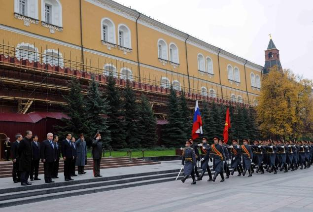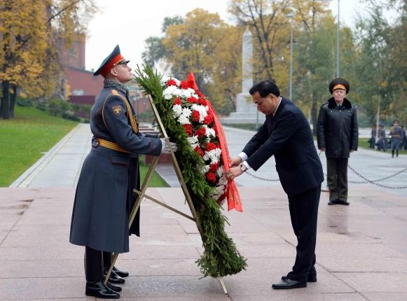 ????新華網北京10月14日電 據新華社“新華國際”客戶端報道,一場秋雨洗滌了莫斯科的寒夜。13日一早,克強總理來到克里姆林宮外的無名烈士墓,憑吊衛國戰爭中的犧牲者。