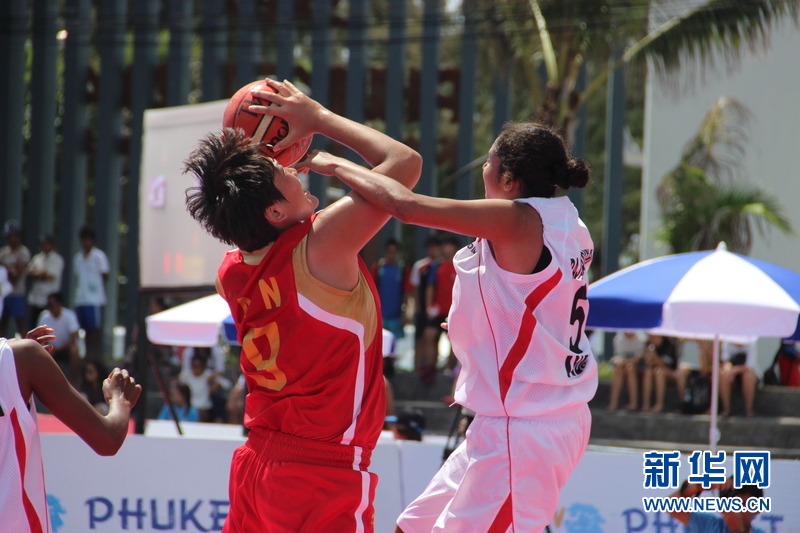 ??? 11月16日,中國沙灘籃球運動員安靜(左)在比賽中。中國體育代表團16日在泰國普吉舉行的第四屆亞洲沙灘運動會上勇奪2枚金牌和2枚銅牌。當天比賽全部結束時,中國隊以3金2銀5銅的成績暫列獎牌榜第五。新華社發(塔納攝)